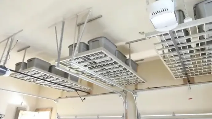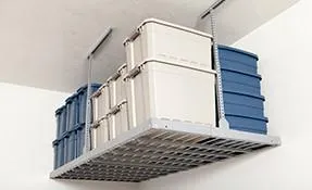 Monkey Bar Ceiling Storage racks are available in multiple powder coated colors to match the entire garage system. Available colors in grey, sand, and white.